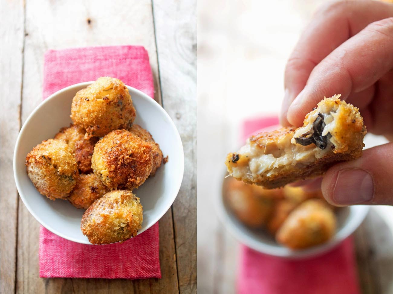 Hacemos bolitas y las pasamos por harina, huevo batido y pan rallado o panko (quedan más crujientes). Las freímos en abundante aceite de oliva suave.